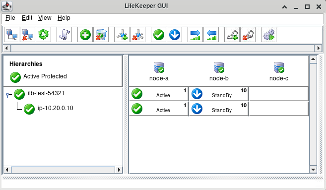 - Back in the LifeKeeper GUI, we see that the newly created ilb-test-54321 resource is Active on node-a and Standby on node-b. In this state, a TCP load balancer with a TCP health check on port 54321 will treat node-a as healthy and node-b as unhealthy, causing all load balancer traffic to be routed to node-a. When placed in a resource hierarchy with a protected application, this resource will ensure that load balancer traffic is always routed to the server on which the application is currently running.