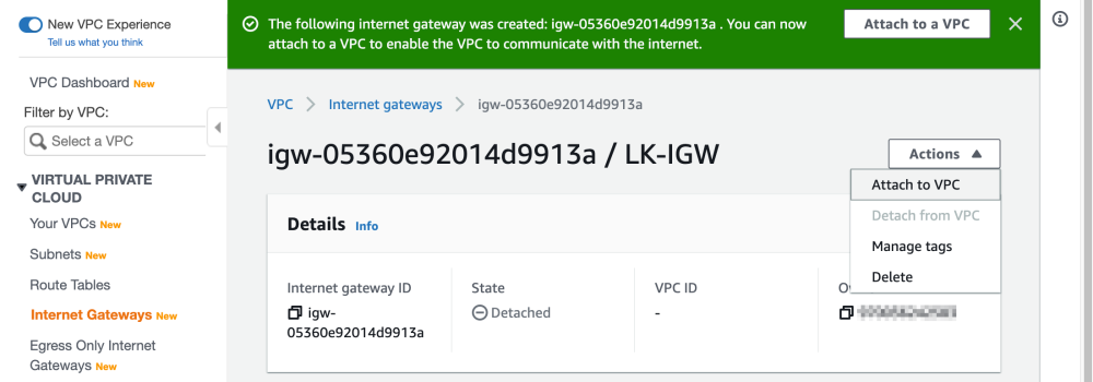 - Once the Internet Gateway is created, select “Attach to VPC”.