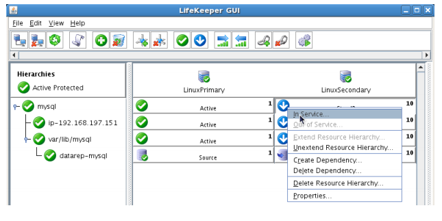 - From the LifeKeeper GUI, right click on the MySQL resource on the Secondary Server (LINUXSECONDARY) and choose IN SERVICE.