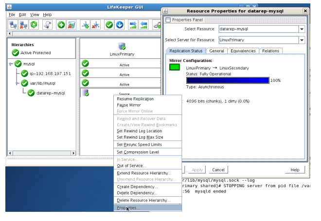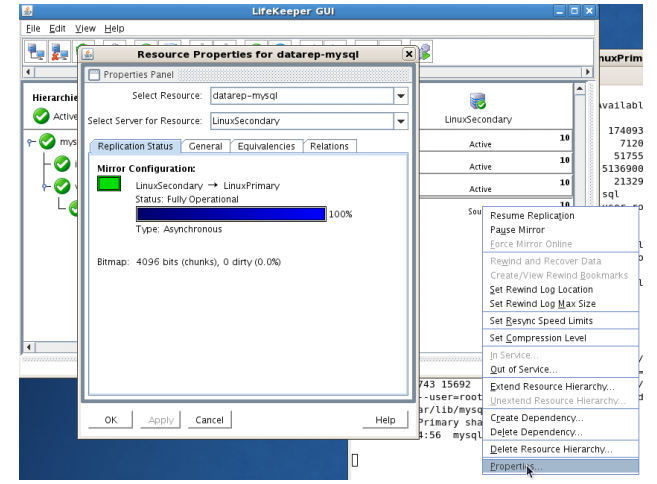 - Using the LifeKeeper GUI, verify the mirror is now reversed and mirroring in the opposite direction. Right click on the “datarep-mysql” resource and select Properties