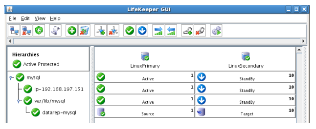 - Using the LifeKeeper GUI, verify that the MySQL and dependent resources are active on LINUXPRIMARY.