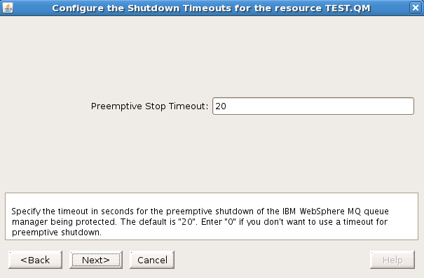 まず、WebSphere MQ のリソースプロパティ画面または上述のリソースコンテクストメニューを開きます。 [Shutdown Timeout Configuration] アイコンまたはメニュー項目をクリックします。以下のダイアログが表示されます。