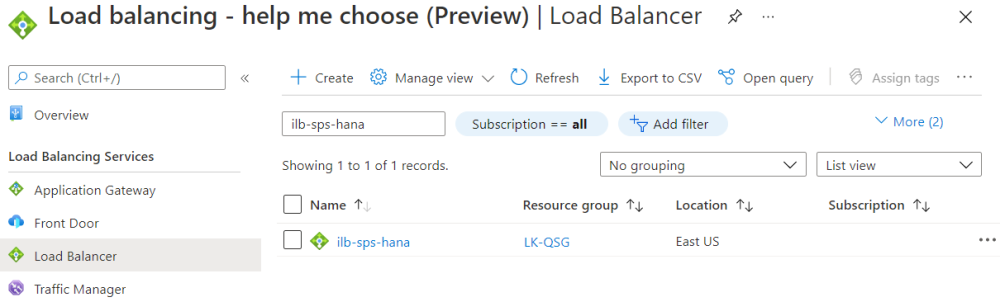 - Create a Load Balancer in Azure, ilb-sps-hana, with the following properties.