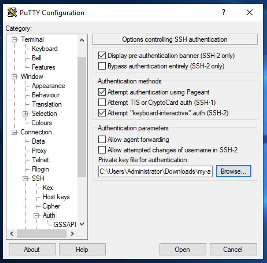 - Open PuTTY and select Connection > SSH > Auth.