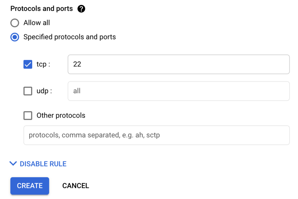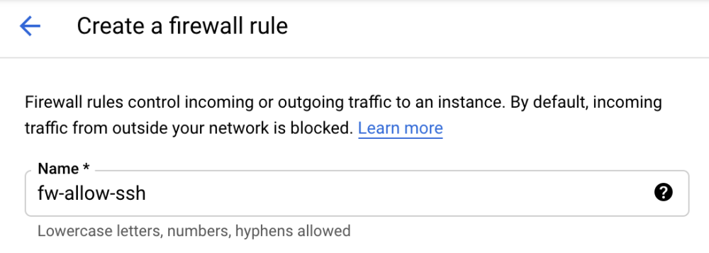 - 以下のステップでは、作業場所からのssh接続を許可して、作業場所からノードを構成できるようにする方法について説明します。「ファイアウォールルールの作成」ウィザードで、名前をfw-allow-sshと指定します。