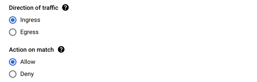- [トラフィックの方向] で「Ingress」を選択し、[一致したときのアクション] で「許可」を選択します。この選択により、次の手順で指定したパターンに一致する受信トラフィックが「許可」されます。