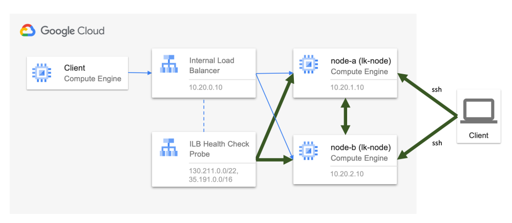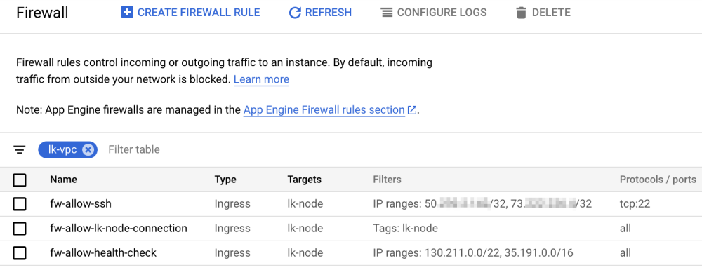 - lk-nodeタグを使用して、内部ロードバランサーからVMへのすべてのヘルスチェックプローブを許可します。 (fw-allow-health-check)