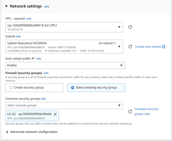 - 前のセクション(LK-SG)で作成したセキュリティグループを選択します。