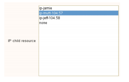 - IP の子リソース を選択します。これは通常、SAP インストール時に指定された仮想ホスト IP アドレス(SAPINST_USE_HOSTNAME)またはフェールオーバーに必要な IP アドレスのいずれかです。
