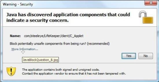 Java 署名/未署名混合コードの警告 – LifeKeeper Java GUI クライアントアプレットをリモートシステムからロードすると、以下のセキュリティ警告が表示されることがあります ブロックするかどうかを確認するメッセージが表示されます。[No] をクリックすると、LifeKeeper GUI の動作が可能になります。 推奨される処置: セキュリティ警告の数を減らすには、2 つのオプションがあります。