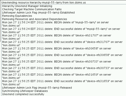 - LifeKeeper GUI メニューから [Edit] を選択し、次に [Resouce] を選択します。ドロップダウンメニューから、 [Unextend Resource Hierarchy] を選択します。