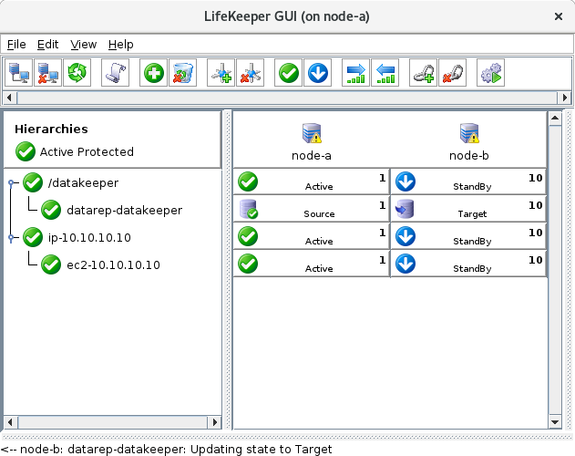 - Check the LifeKeeper GUI to see the status of the datarep-datakeeper resource. The node status should be “Source” and the other node should be labeled as “Target”.