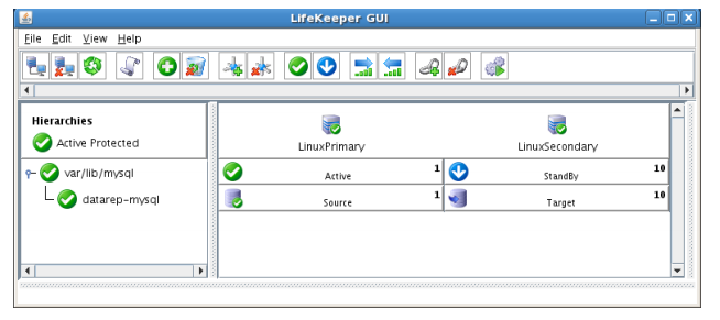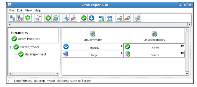 - From the LifeKeeper GUI, right click on the top of the resource hierarchy on the Secondary Server (LINUXSECONDARY) and choose IN SERVICE.
