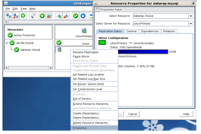 - Using the LifeKeeper GUI, verify the mirror is now reversed and mirroring in the opposite direction. Right click on the “datarep-mysql” resource and select Properties
