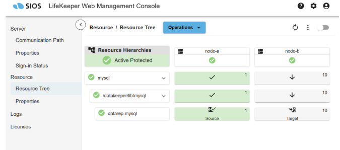 注意: LifeKeeperは、MySQLリソースがFileSystem(データレプリケーション)リソース (/datakeeper/lib/mysql) に依存していることを自動的に識別します。ファイルシステムリソースはGUIのMySQLリソースの下に表示されます。 - 「Next」をクリックしてファイルシステムリソースをセカンダリーノードに拡張します。