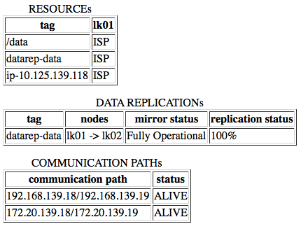 LifeKeeper のクラスタ設定が以下の図の状態であるとき、取得できる JSON フォーマットと HTML フォーマットを示します。
