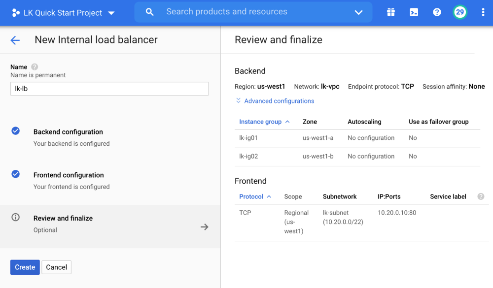 - Specify the name as lk-lb, then configure the backend parameters. Select Region, Network as lk-vpc, then select two instance groups (lk-ig01 and lk-ig02) from the dropdown menu to be added to the backend pool.