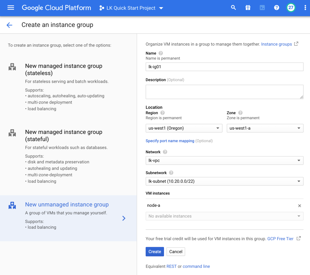 In order to use an Internal Load Balancer, the first step is to create Instance Groups containing each of our nodes. Create Instance Groups with the following parameters: