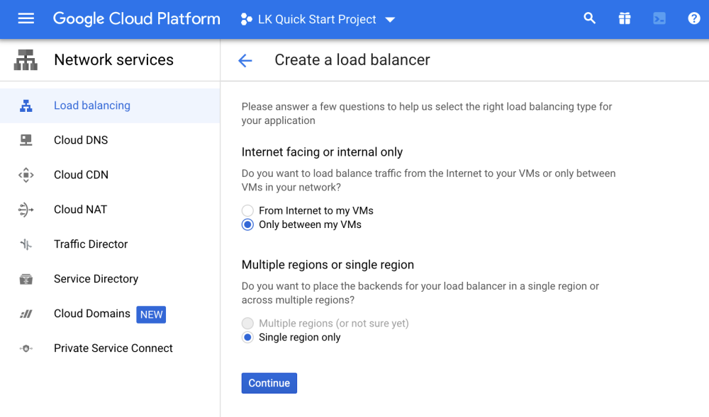 - Select “Only between my VMs” (meaning Internal Load Balancer), and Single region only. Click “Continue”.