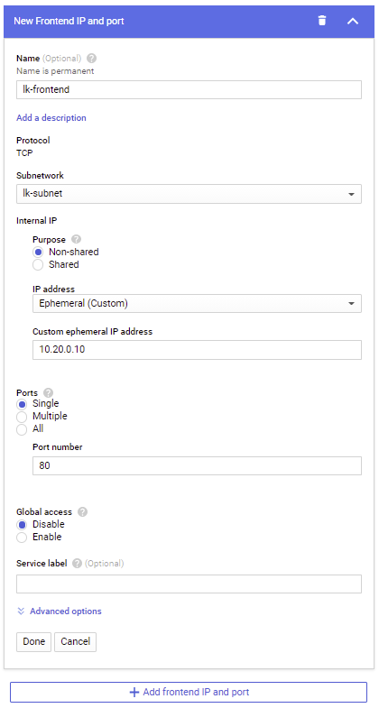 - Move to the “Frontend configuration” tab. Provide the name and subnetwork for the frontend. In this example we will use the name lk-frontend and select the lk-subnet subnetwork. Under “IP address”, choose “Ephemeral (Custom)” and specify the custom ephemeral IP address to be used by the load balancer frontend. In this example we will use IP address 10.20.0.10. Under “Ports”, select either “Single”, “Multiple”, or “All” as appropriate, based on the application that traffic is being routed to, and enter any required ports. In this example we will forward traffic on TCP port 80.
