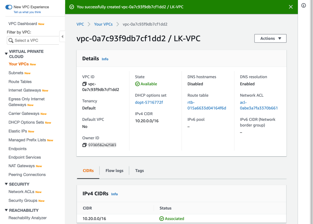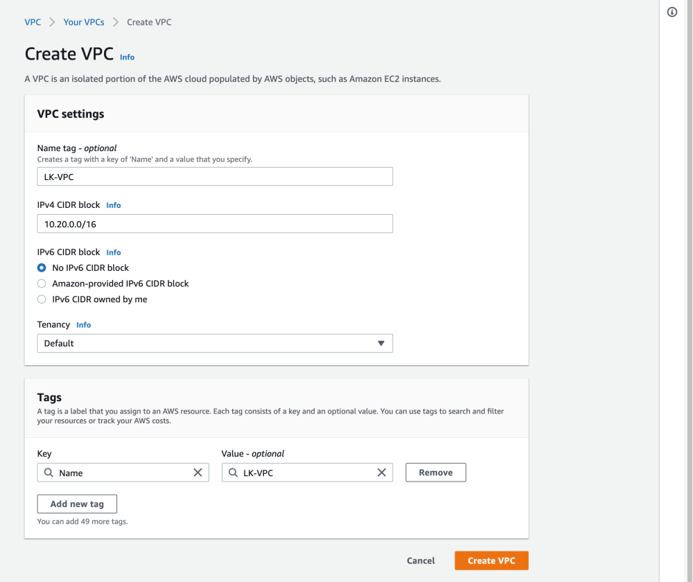 - 「Create VPC」ウィザードで、VPCの名前(LK-VPC)とIPv4 CIDRブロック10.20.0.0/16を入力します。