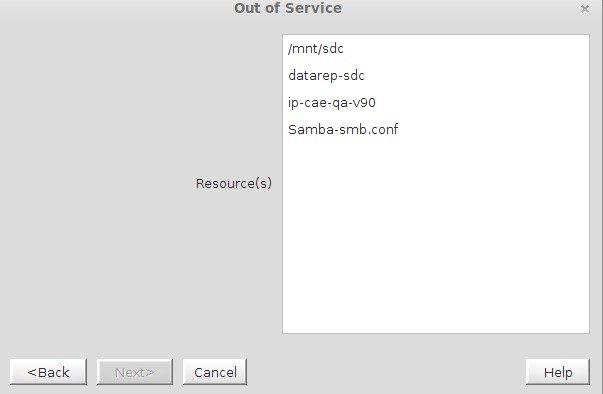 Select a Resource - このダイアログのリストには、LifeKeeper クラスタ内で in service になっているすべてのリソースの名前があります。out of service にするリソースを選択してください。