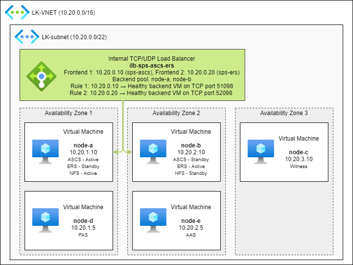 - node-a (プライマリーASCSインスタンスホスト、スタンバイERSインスタンスホスト、プライマリーNFSサーバー)