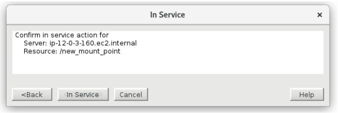- Select Edit > Resource >In Service or right-click on the resource in the left pane on the LifeKeeper GUI and select In Service.