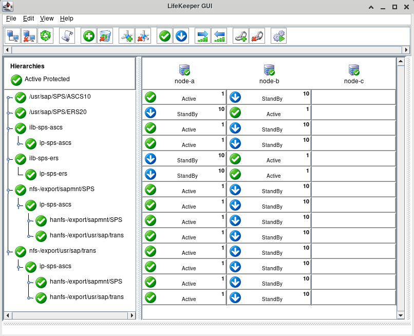 Add the line ‘SAP_NFS_CHECK_DIRS=/sapmnt/SPS’ to /etc/default/LifeKeeper on node-a and node-b to allow the SAP Recovery Kit to monitor the availability of the sps-ascs:/export/sapmnt/SPS NFS share before performing administrative tasks that require access to files found on the shared file system.