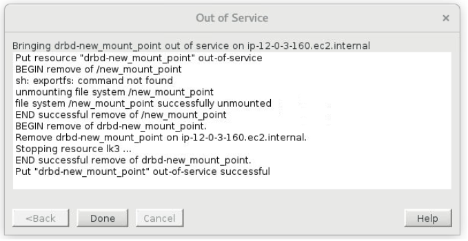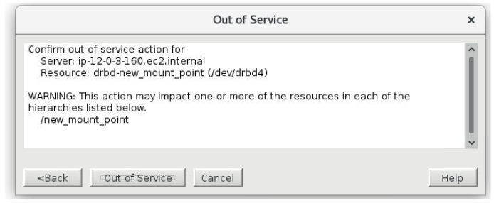 - Another information box will appear confirming that the DRBD resource is successfully out-of-service.