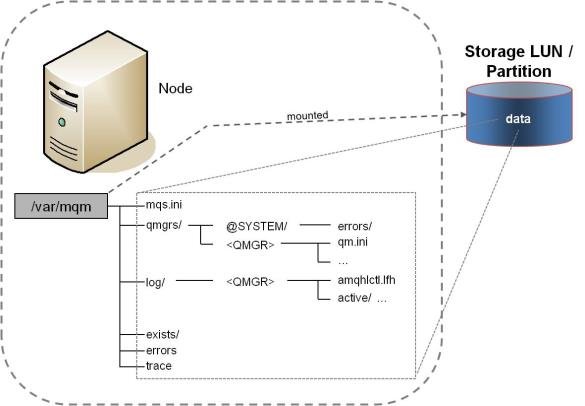 この設定では、 /var/mqm ディレクトリ全体が、LifeKeeper でサポートされる共有ストレージ (SCSI、SAN、NAS、または複製されたストレージ) にマウントされます。