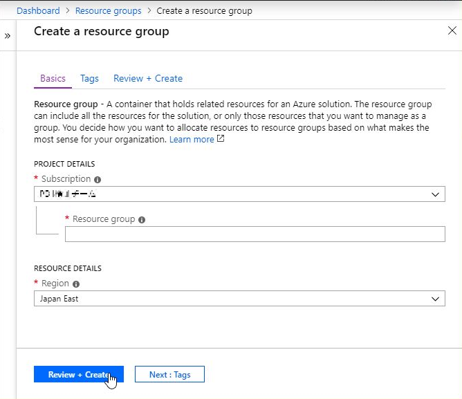 を選択し、本環境で使用するリソースグループを作成します。必要な値を入力し、