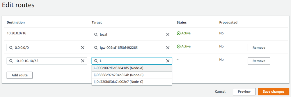 - [Save changes] をクリックして、ルートをルートテーブルに追加します。