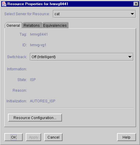 これらの変更に従ってリソース階層を更新するには、まず、変更した ボリュームグループの [Resource Properties] ダイアログを開きます。このダイアログは、アクティブなボリュームグループリソースを右クリックするか、 [Properties] を選択するか、 [Edit] > [Resource] > [Properties] メニューを選択し、 [Select Resource] フィールドで適切なボリュームグループリソースを選択することで開けます。 [Resource Properties] ダイアログは以下の図 4 に示すように表示され、下部に [Resource Configuration] ボタンがあります。