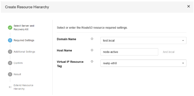 - For required settings, enter the domain name, local host name, and corresponding Virtual IP resource. Then click Next.