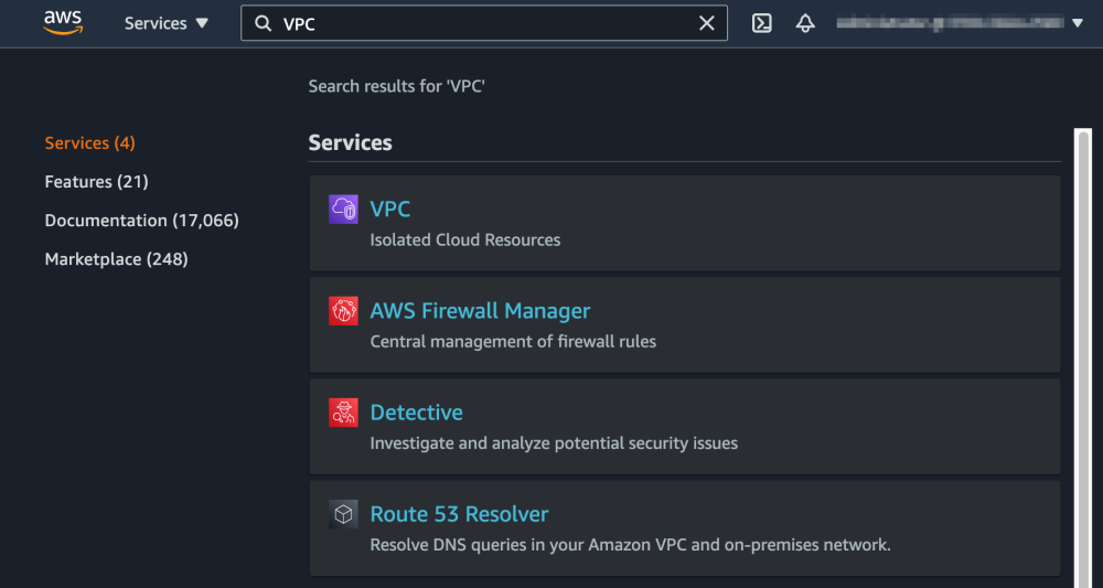 AWS has a significant and growing number of services available. To move to a different service you can type in the name of the service in the search box at the top of the AWS console. Select the service from the list. The screenshot below shows the VPC (Virtual Private Cloud) service as a selection choice.